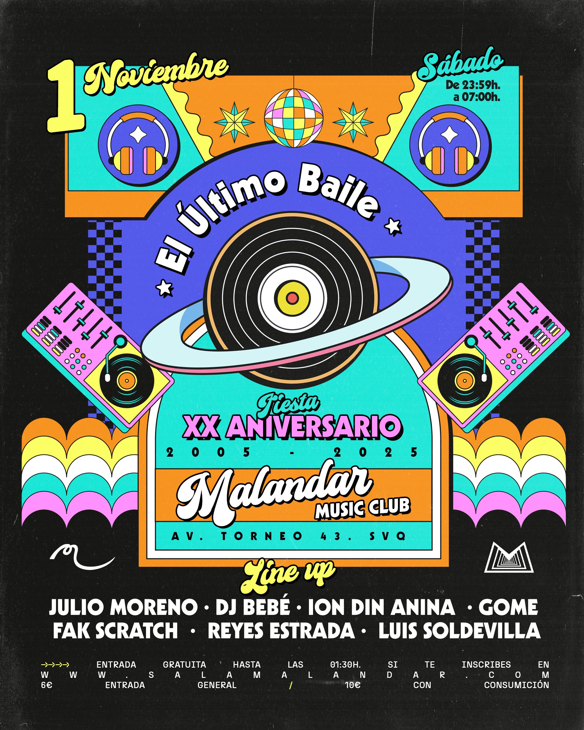 celebraremos “EL ÚLTIMO BAILE”, la última noche de Malandar Music Club COMO CLUB DE BAILE de la manera que lo hemos conocido estos años. Esa noche tendremos a los djs que han formado parte de la historia de la sala, encabezados por Julio Moreno, el creador de Sala Malandar. Los djs participantes serán Julio Moreno, Dj Bebé, Ion Din Anina, Fak Scratch, Gome, Luis Soldevilla y Reyes Estrada, djs que hicieron historia a lo largo de diferentes etapas.